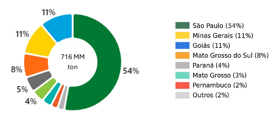 The harvest in the central-south region – referring to the states of Goiás, Mato Grosso, Mato Grosso do Sul, Minas Gerais, Paraná, and São Paulo – represents the largest volume of sugarcane milling in the country. In the 2023/2024 harvest, the region contributed approximately 640 million tons of sugarcane out of a total of 716 million tons of sugarcane milled during the period, as shown in Figure 1.